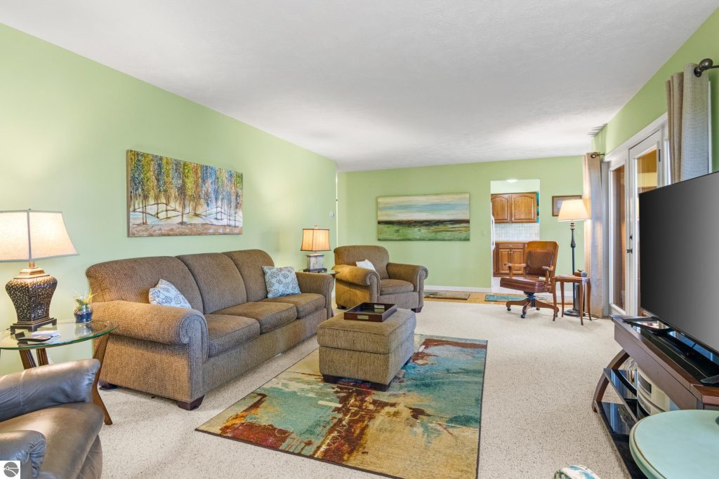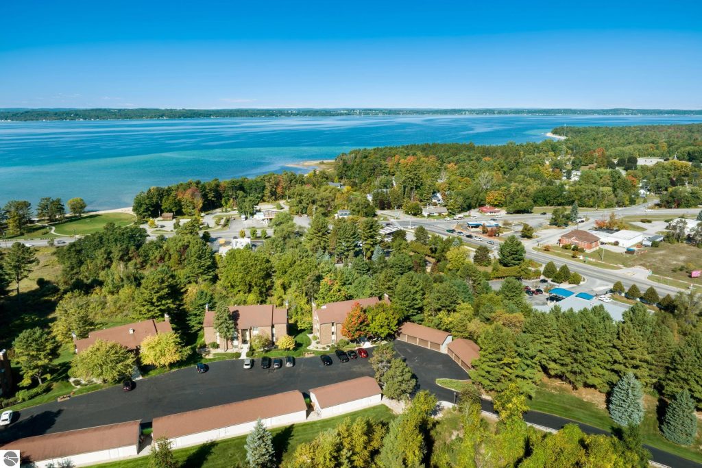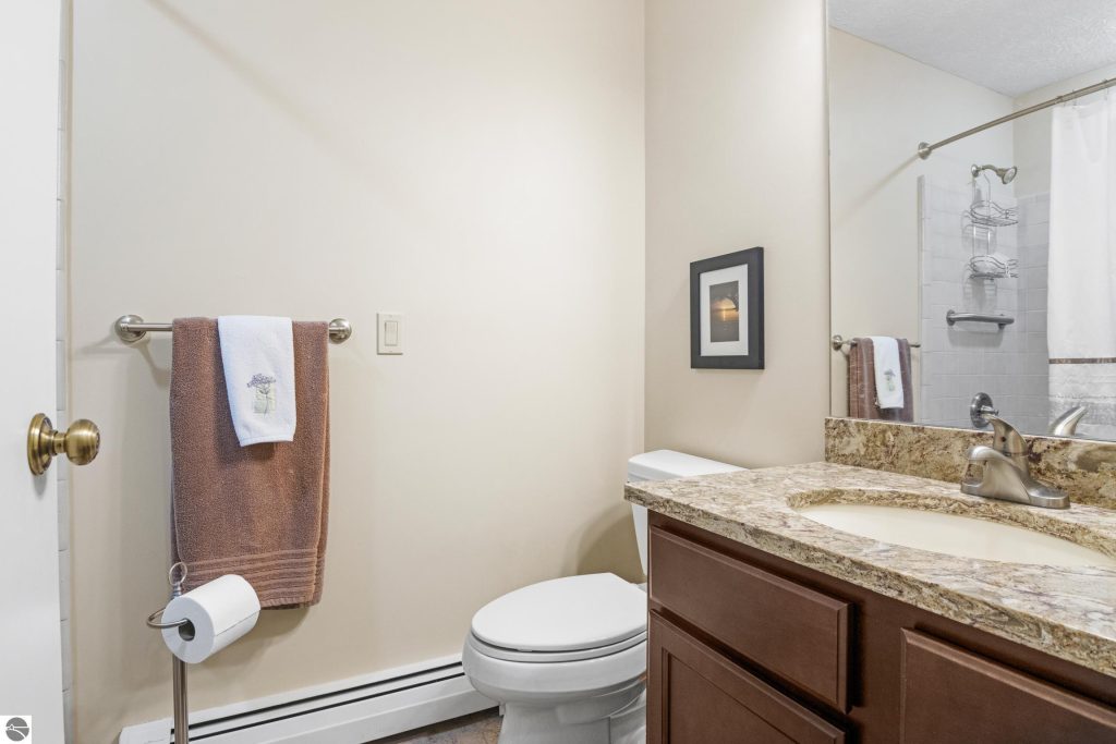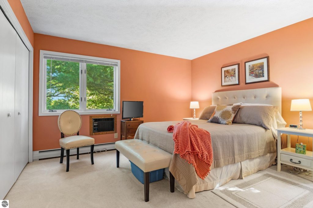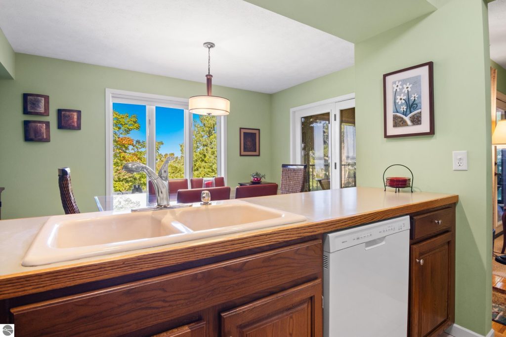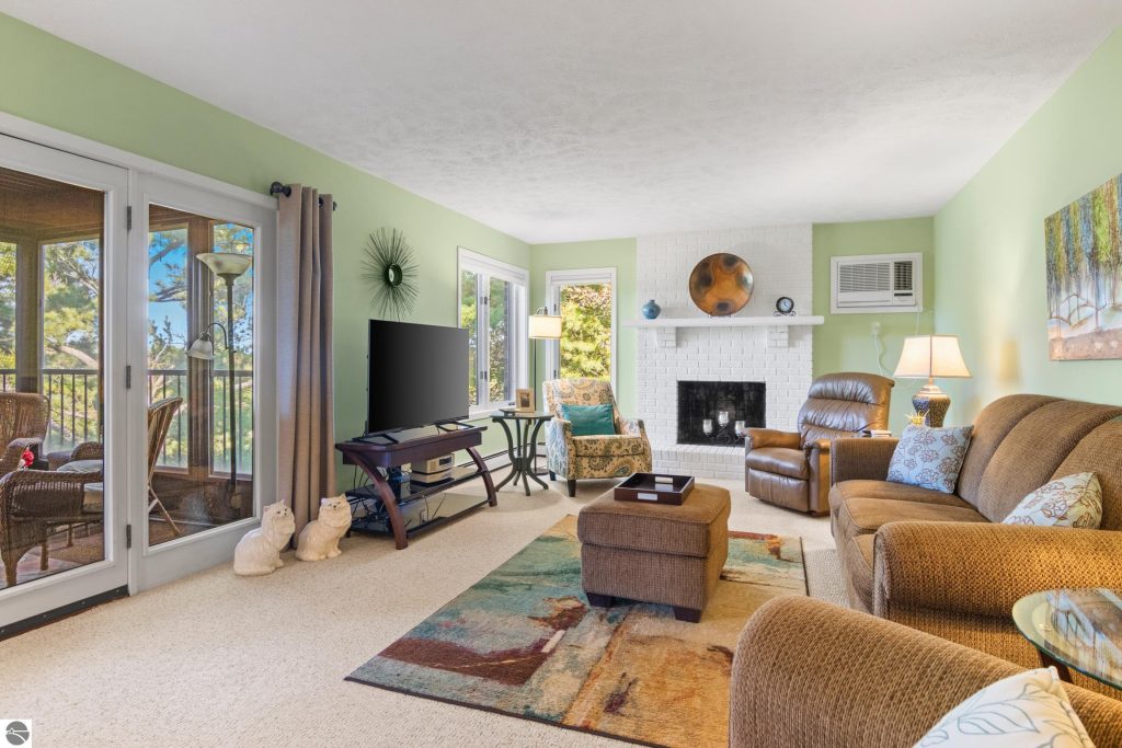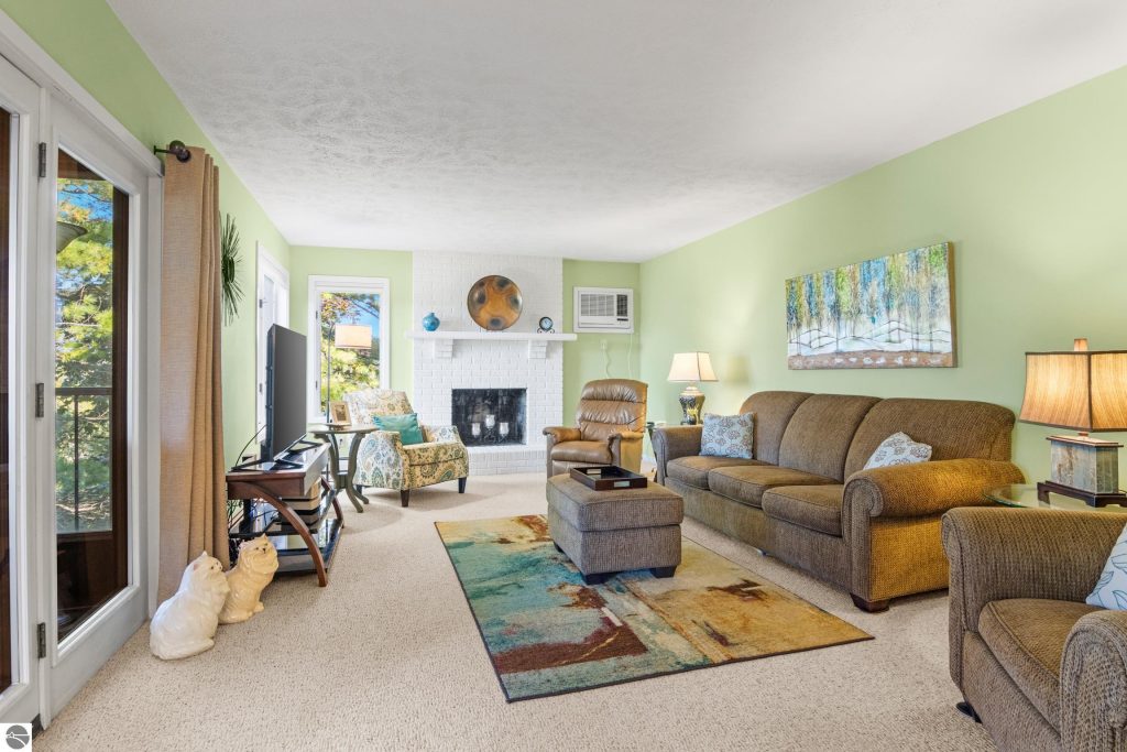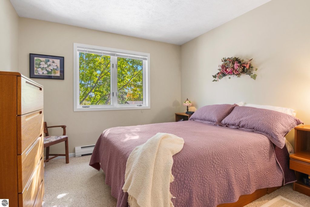 Enjoy some fun East Bay views from this immaculate 2 BR 2 Bath Condo in Juniper Hills. Check out the fantastic location offering both maximum privacy and convenience close to Bay beaches and parks, the TART trail, and the Grand Traverse Resort spa, golf, shops, and restaurants. This upper end unit is found in the end building and has a great layout for social gatherings. There is a bay view from the kitchen through the dining room and wooded views from the living room through the three-season porch. Many updates include the tiled kitchen floor and backsplash, new paint palette throughout, plus an updated primary bath with tiled shower, glass shower door, and Cambria counter. The living room features a cozy, woodburning, brick fireplace and large windows framing a glass door to the screened 10×12 porch, where you can catch a breeze, read a book, or entertain in a treehouse ambiance. The dining room offers another entry to the porch. A real laundry room, not a closet, offers counter space, drawers and shelves in addition to the washer and dryer. All major appliances are included. Amenities include efficient hot water baseboard heat, cable TV and internet. Your monthly maintenance fee covers heat, water, sewer, waste removal, and the usual exterior building and grounds maintenance, including snow removal. Park your vehicle and bicycles in the oversized one-car garage with an electric door opener, located just steps from the door. And, don’t worry, the usual pet is allowed.