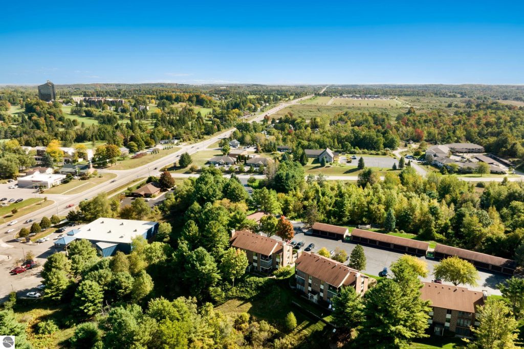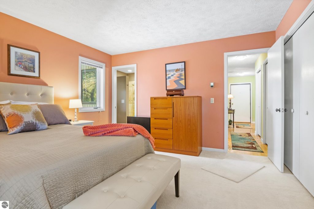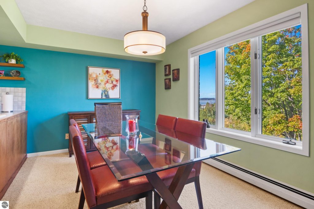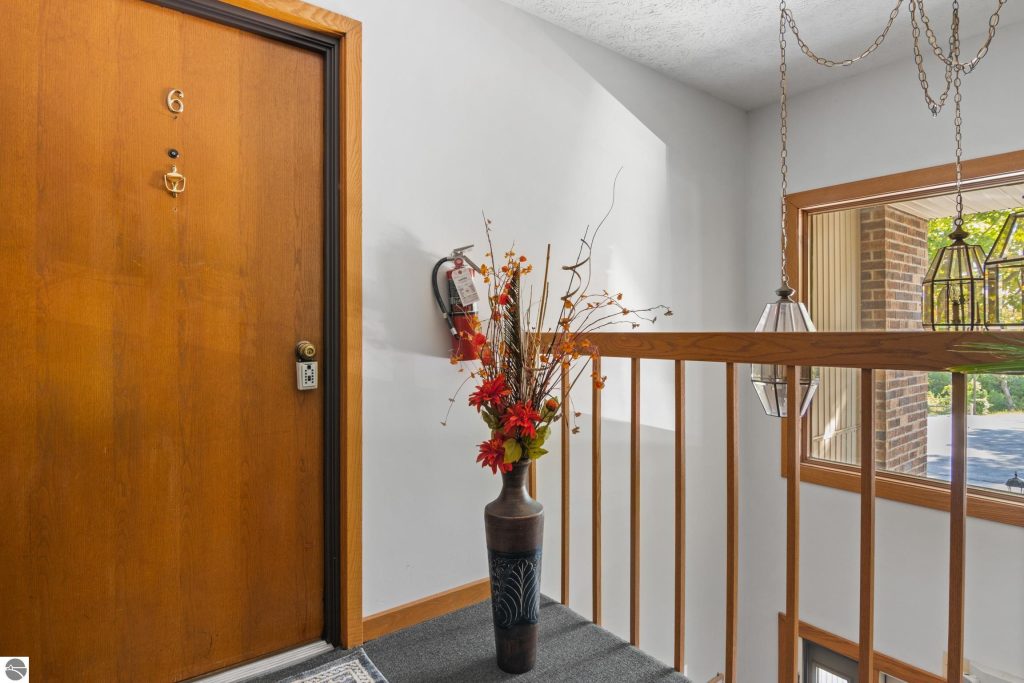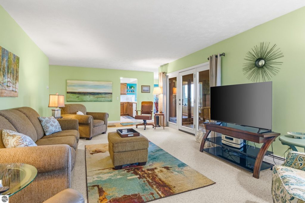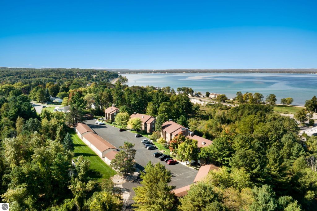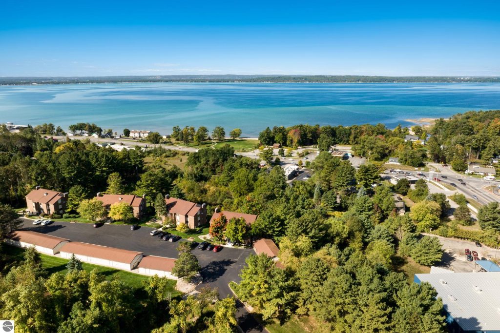 Enjoy some fun East Bay views from this immaculate 2 BR 2 Bath Condo in Juniper Hills. Check out the fantastic location offering both maximum privacy and convenience close to Bay beaches and parks, the TART trail, and the Grand Traverse Resort spa, golf, shops, and restaurants. This upper end unit is found in the end building and has a great layout for social gatherings. There is a bay view from the kitchen through the dining room and wooded views from the living room through the three-season porch. Many updates include the tiled kitchen floor and backsplash, new paint palette throughout, plus an updated primary bath with tiled shower, glass shower door, and Cambria counter. The living room features a cozy, woodburning, brick fireplace and large windows framing a glass door to the screened 10×12 porch, where you can catch a breeze, read a book, or entertain in a treehouse ambiance. The dining room offers another entry to the porch. A real laundry room, not a closet, offers counter space, drawers and shelves in addition to the washer and dryer. All major appliances are included. Amenities include efficient hot water baseboard heat, cable TV and internet. Your monthly maintenance fee covers heat, water, sewer, waste removal, and the usual exterior building and grounds maintenance, including snow removal. Park your vehicle and bicycles in the oversized one-car garage with an electric door opener, located just steps from the door. And, don’t worry, the usual pet is allowed.