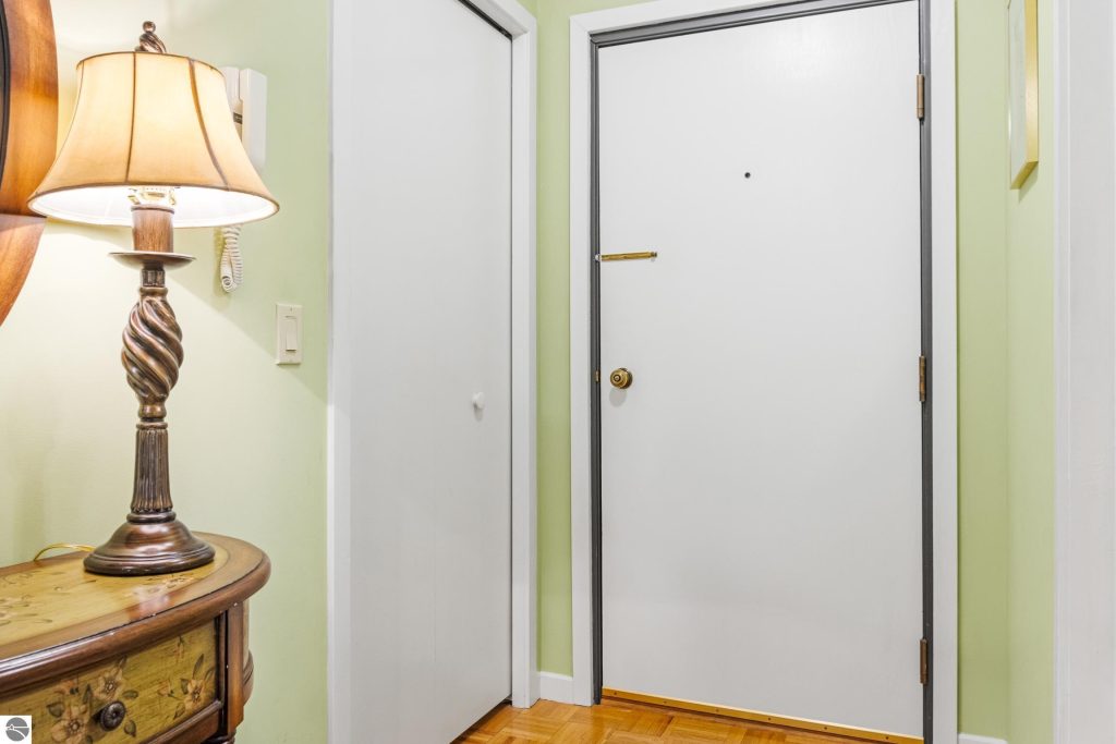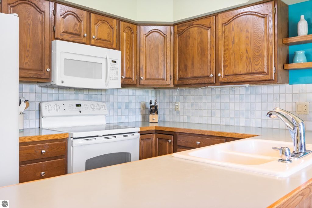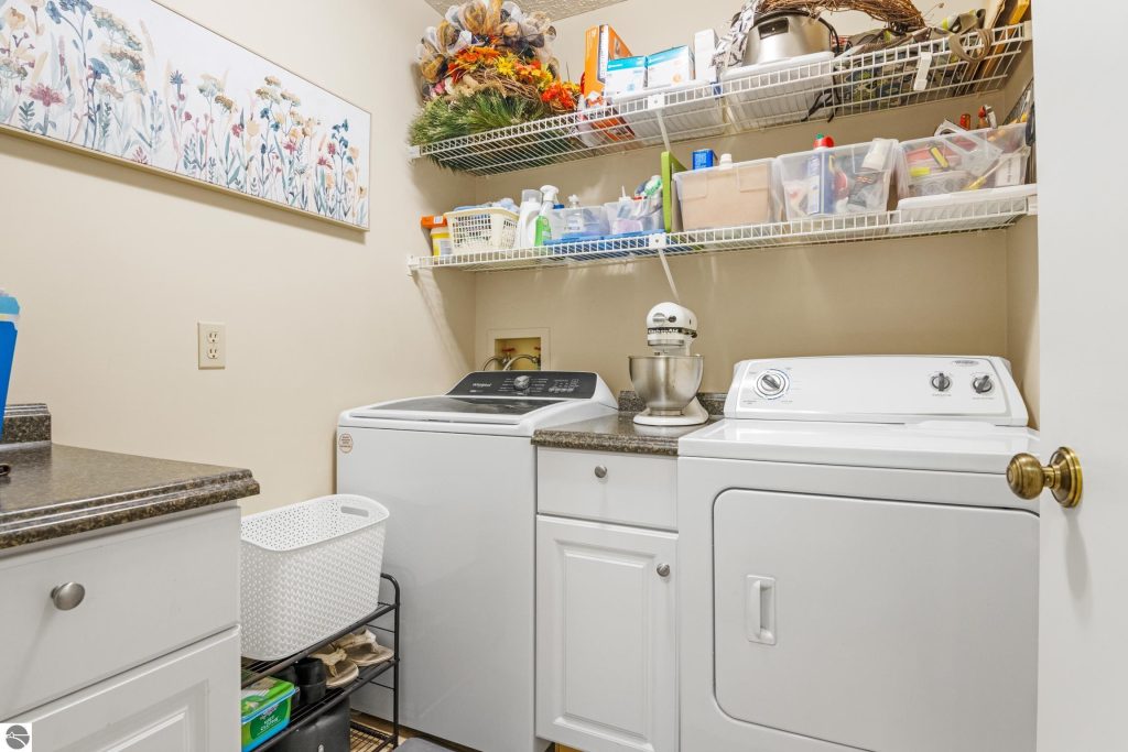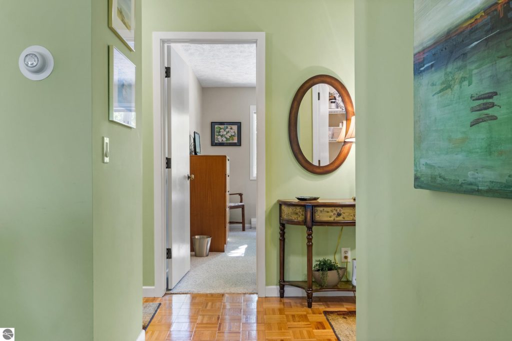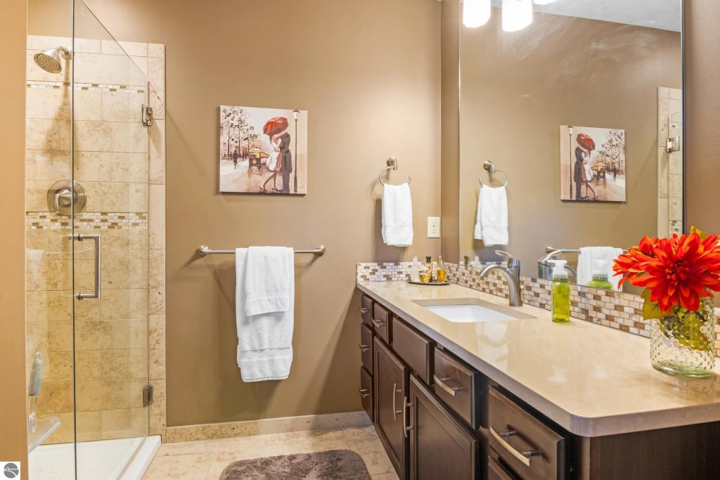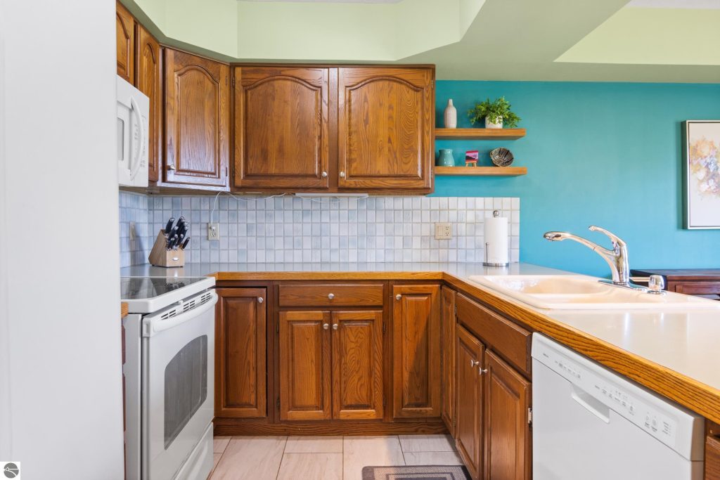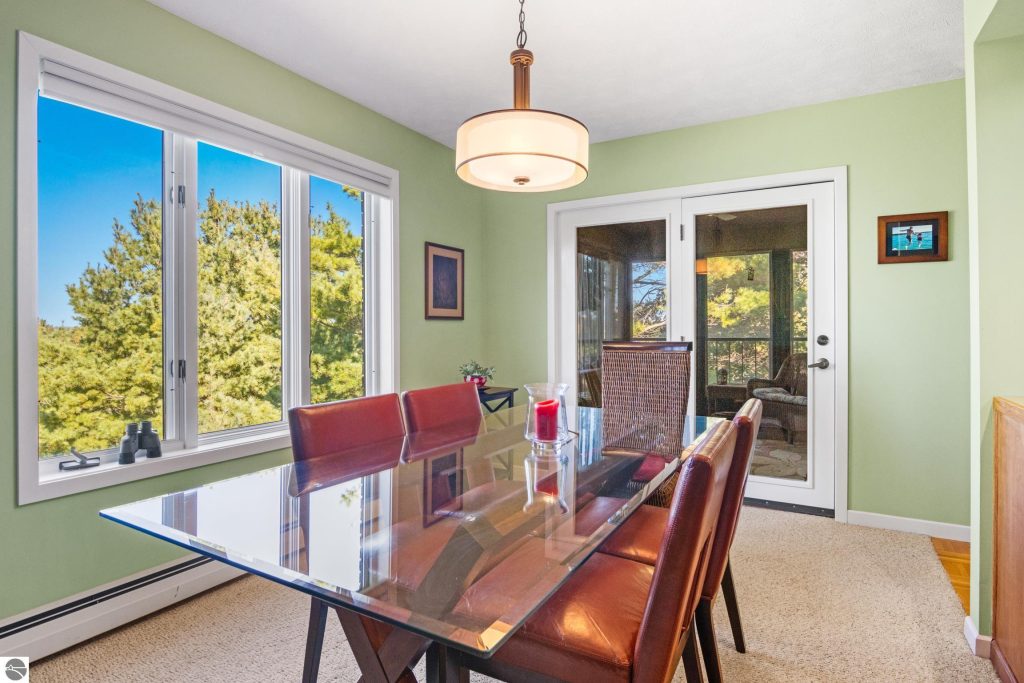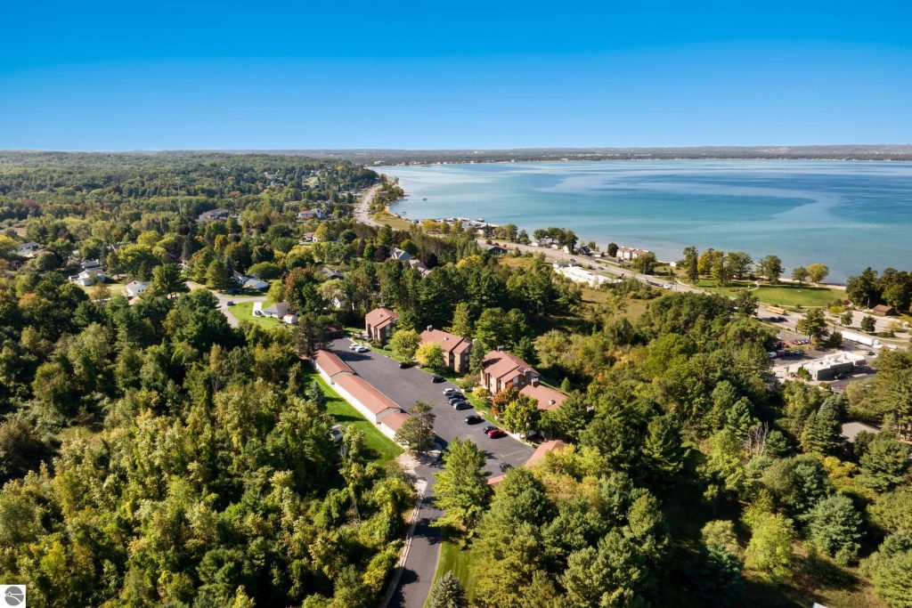 Enjoy some fun East Bay views from this immaculate 2 BR 2 Bath Condo in Juniper Hills. Check out the fantastic location offering both maximum privacy and convenience close to Bay beaches and parks, the TART trail, and the Grand Traverse Resort spa, golf, shops, and restaurants. This upper end unit is found in the end building and has a great layout for social gatherings. There is a bay view from the kitchen through the dining room and wooded views from the living room through the three-season porch. Many updates include the tiled kitchen floor and backsplash, new paint palette throughout, plus an updated primary bath with tiled shower, glass shower door, and Cambria counter. The living room features a cozy, woodburning, brick fireplace and large windows framing a glass door to the screened 10×12 porch, where you can catch a breeze, read a book, or entertain in a treehouse ambiance. The dining room offers another entry to the porch. A real laundry room, not a closet, offers counter space, drawers and shelves in addition to the washer and dryer. All major appliances are included. Amenities include efficient hot water baseboard heat, cable TV and internet. Your monthly maintenance fee covers heat, water, sewer, waste removal, and the usual exterior building and grounds maintenance, including snow removal. Park your vehicle and bicycles in the oversized one-car garage with an electric door opener, located just steps from the door. And, don’t worry, the usual pet is allowed.