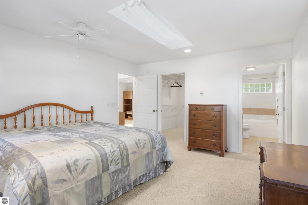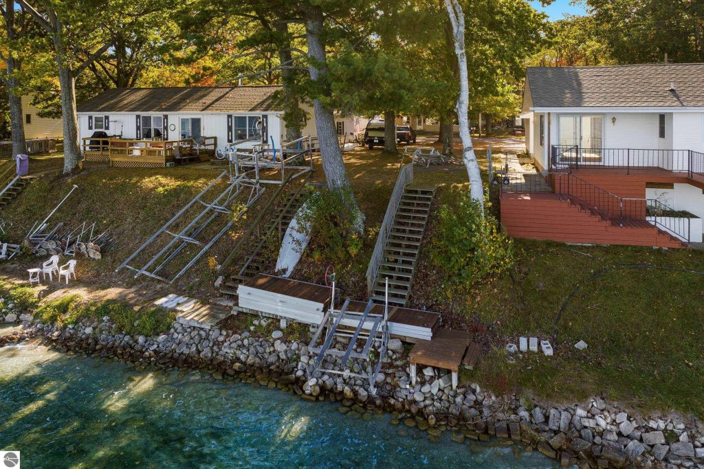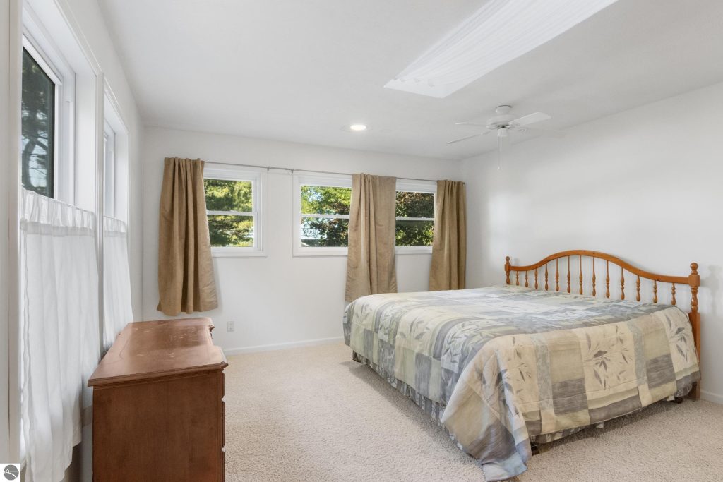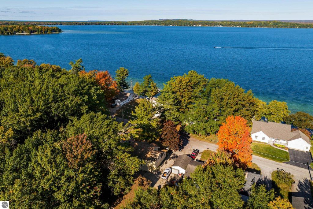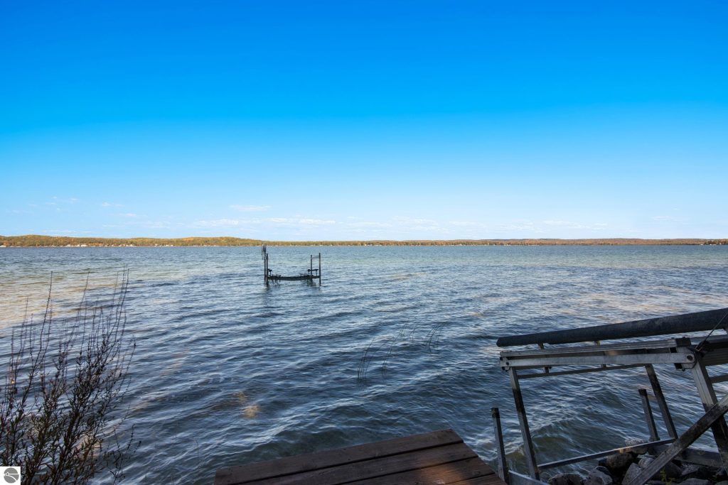 Access to Big Platte Lake comes with this year-round four-bedroom, two-bath home and a huge, detached garage with a workshop. Steps lead to your shared 25 feet of lake access across the street, on the southwest side of the lake. Wear your swimsuit and bring the kayaks, or add a dock to launch into all-sports fun. Completely remodeled in 2001, the two-story home has 2202 sq ft, with plenty of bedrooms for guests or use the space for crafts, hobbies, working out or reading. Everything sparkles and is in move-in condition with built-ins for your belongings. The dining room faces the lake, as does the kitchen sink, so prepare, clean up, and feast this holiday and still enjoy the view. Lengthy counters and plentiful cupboards give you the elbow room and storage you need, with additional cupboards in the hallway for your special dishware. Multiple windows add light to the large living area. The main level also includes a bedroom and full bath, a laundry room with a sink and cupboards, and a mudroom entry. Upstairs are three more bedrooms. The primary bedroom includes a private bath and a large, walk-in closet. A vaulted wood ceiling and bookcase in another room offer a cozy space for your private library. When you are in a social mood, gather on the front deck with friends and head to the back patio. A 48×24 garage has lots of room for vehicles and toys, and the enclosed workshop gives you space to create, tinker and fix. Big Platte Lake is known for swimming, fishing, sailing and boating. Paddle from here to Lake Michigan.