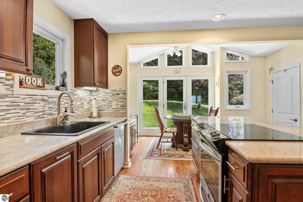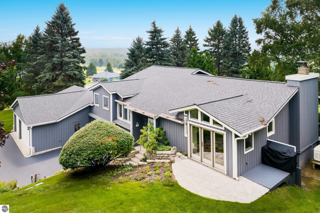 Beautiful view of Crystal Lake from this updated 4 BR home surrounded by a lush lawn and exceptional landscaping on 1.8 acres. Plenty of room here to invite guests, who will love the inground pool and the golf course just down the street. First of the homes many features is a new gourmet kitchen with granite counters, cooking island, and walk in pantry with skylight. A spectacular dining nook with vaulted ceiling is illuminated by floor-to-ceiling windows with views of nature. A separate dining area beside the kitchen can seat everyone. Lake and hilltop countryside views accentuate the living room with a cozy natural fireplace, built-in shelves, dry bar and doors lead out to the large deck to enjoy the sight of blue water and the green golf course. Main floor has not 1 but 2 bedroom suites, one with a lake view from your bed and custom private bath with double sinks and a looong walk-in closet. A 3rd BR includes an attractive office or library nook with window. Finished LL has a large 4th BR, craft room, game room, a sauna, and a spacious family room with tray ceiling, more built-ins and walkout access to the inground pool. Throughout the home are wood floors, recessed lighting, vaulted-ceiling accents and ceiling fans. Put your extra vehicle in the attached, finished, oversized garage. Whole house generator ensures power no matter what, and an extra storage area is ready for your equip. or gear. Walk or take your own cart down the street to the Crystal Lake Golf Club serving food and drink. Close to Beulah, Crystal Lake beaches and marinas. A short drive to Lake Michigan, the Sleeping Bear Dunes National Park and Crystal Mountain.